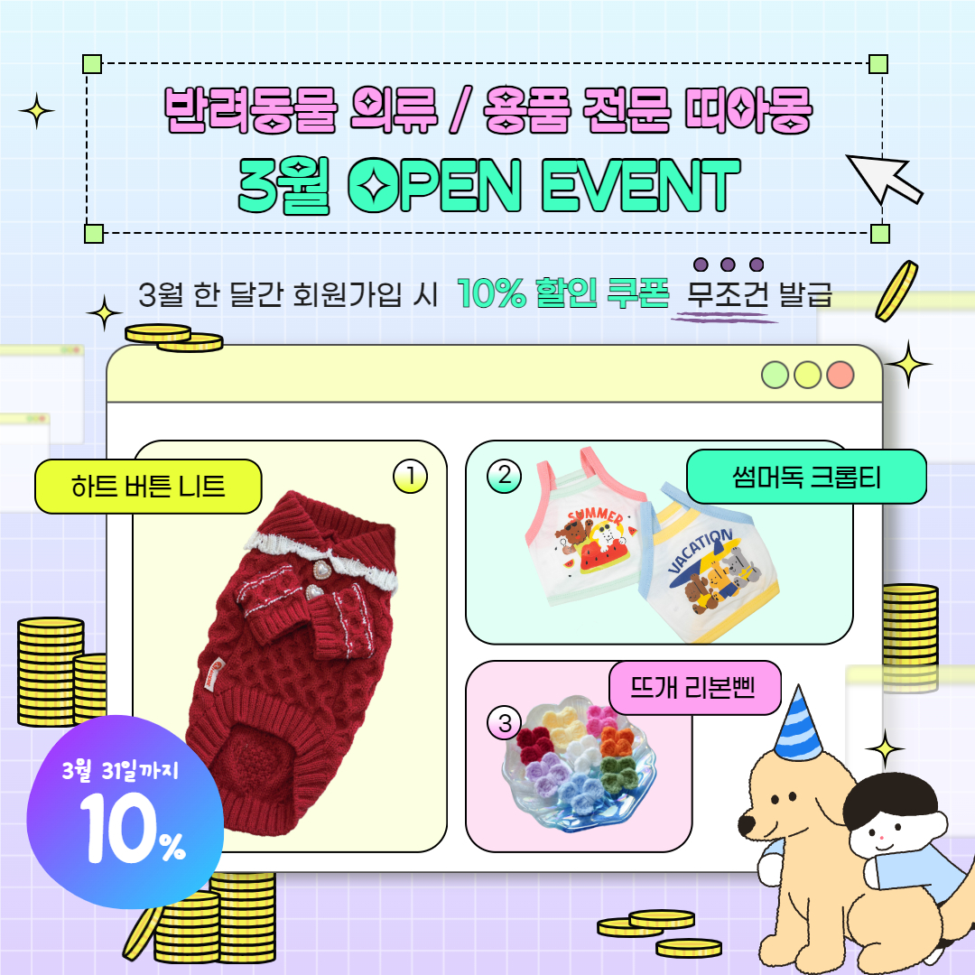 드림플로우의 온라인 애견용품 브랜드 ‘띠아몽’이 3월 한 달간 신규 도매회원에게 모든 제품에 사용할 수 있는 10% 할인 쿠폰을 제공한다고 밝혔다.