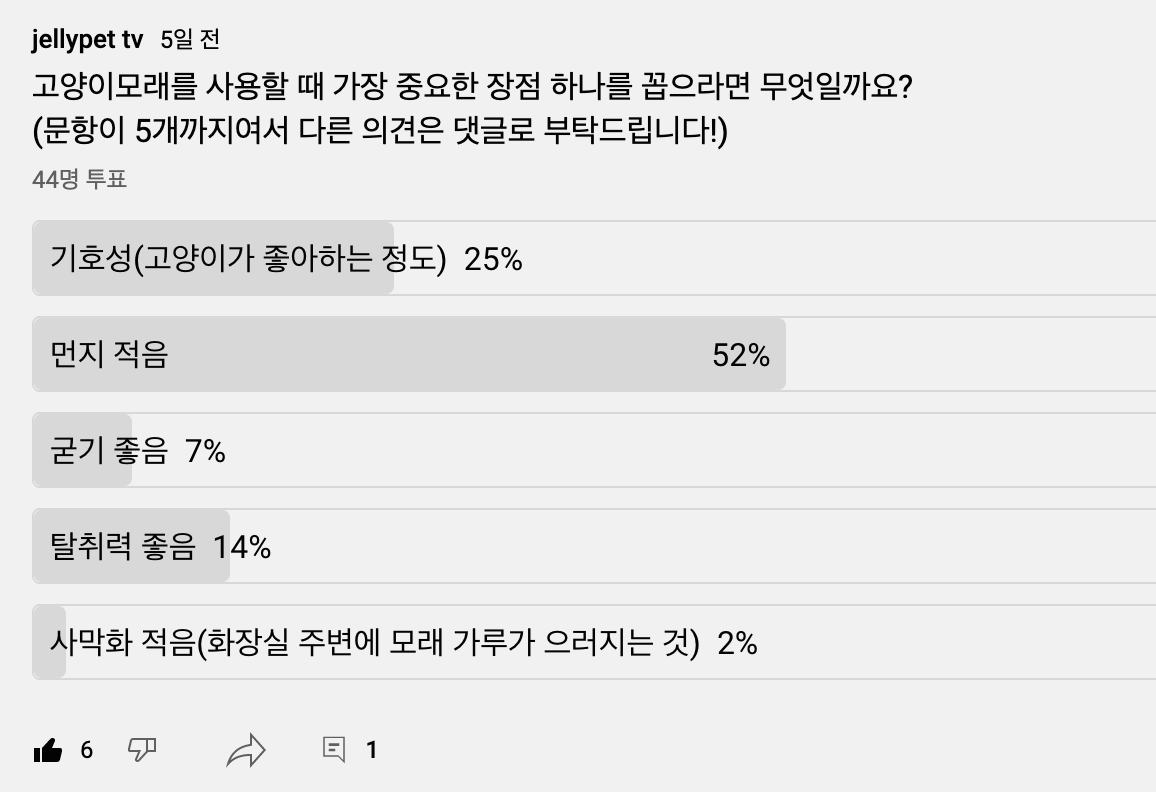 얼마전 유튜브 젤리펫 채널(www.youtube.com/jellypet )에서 고양이모래 중 중요한 요소에 관한 관련설문조사를 했습니다.